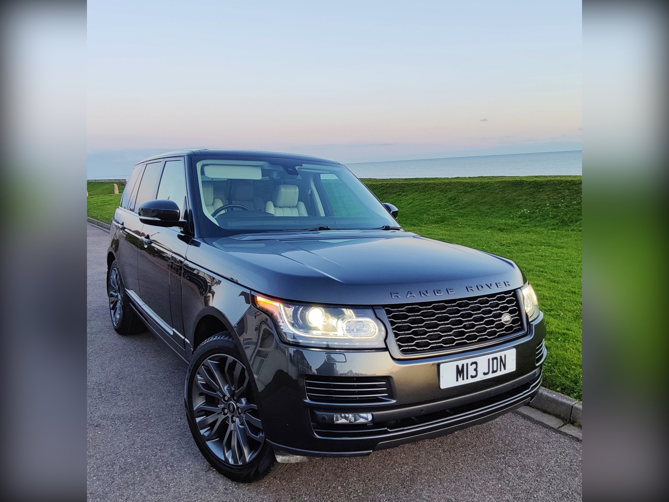 Causeway Grey metallic with White leather, piano black trims and a fully opening panoramic sunroof.
